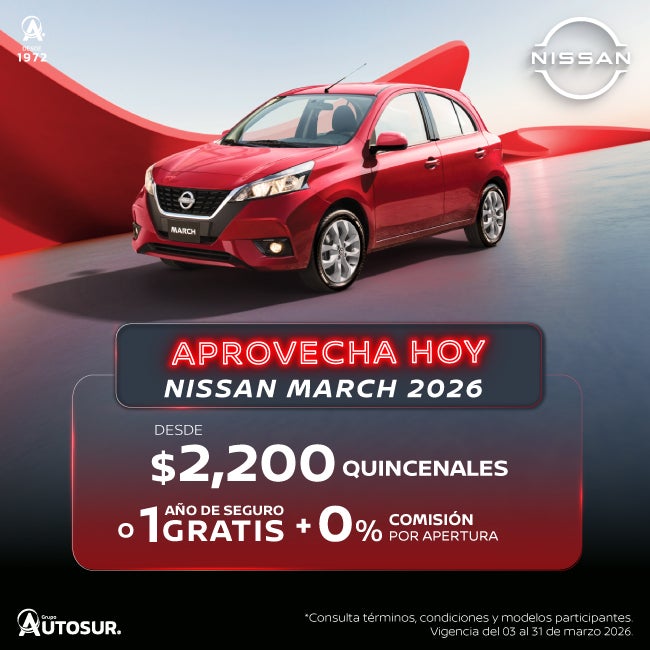 Se aplica para MARCH SENSE TM 26 en plan tradicional CrediNissan con el 40% de enganche a 72 meses, 1 año de seguro gratis y 0% comisión por apertura. Tasa anual de 16.69% y CAT promedio sin IVA de 18.9%. No aplica con otras promociones ni en compra de flotillas. Para conocer planes y modalidades de crédito, verificar precios, requisitos de contratación, comisiones, disponibilidad, términos y condiciones, consulta a tu Distribuidor Autorizado Nissan. Vigencia del 03 al 31 de marzo 2026.